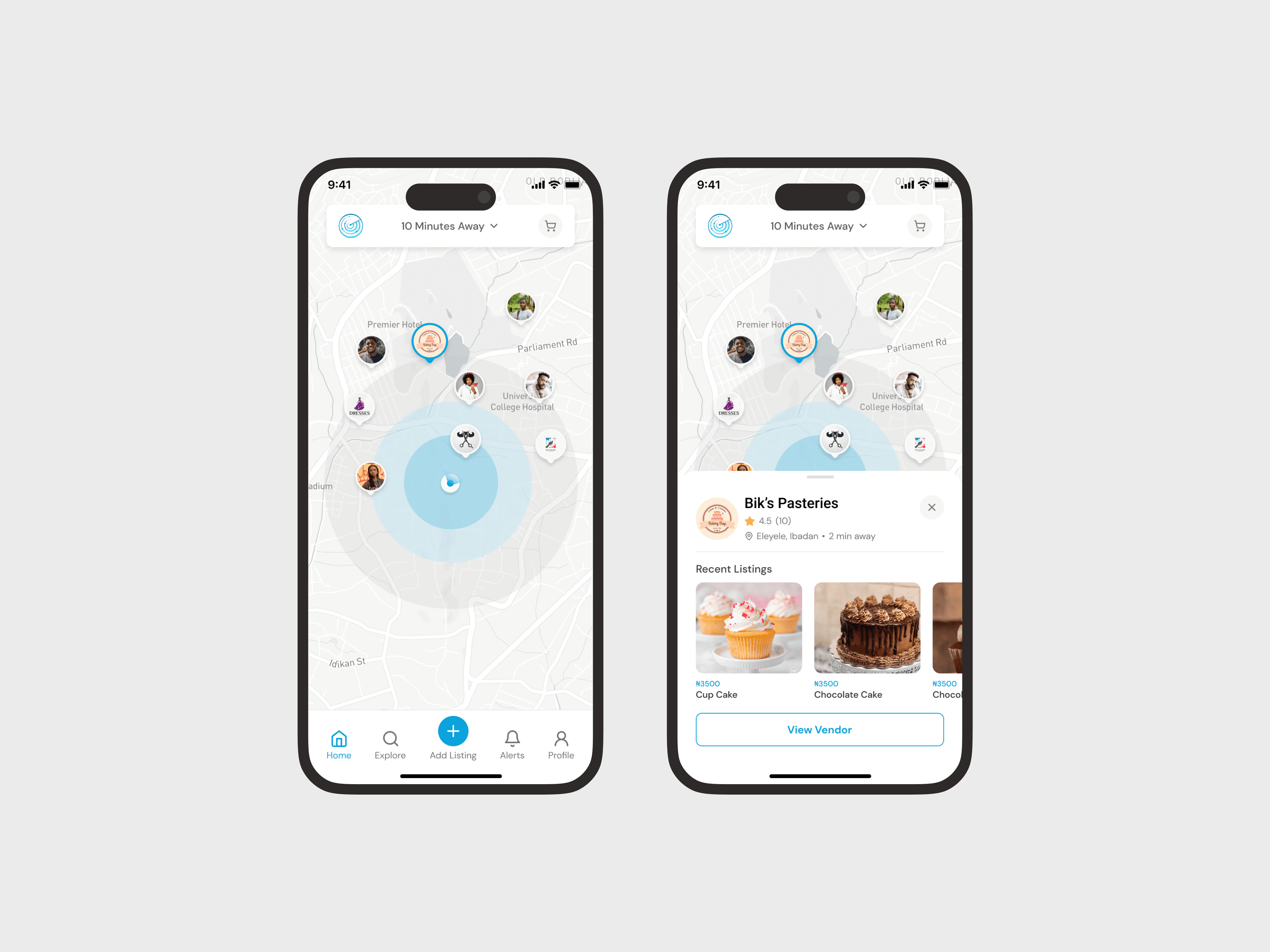An interactive map view that helps users discover nearby vendors, services, and listings. Tapping on a vendor reveals quick details and recent products, making local discovery fast and intuitive.