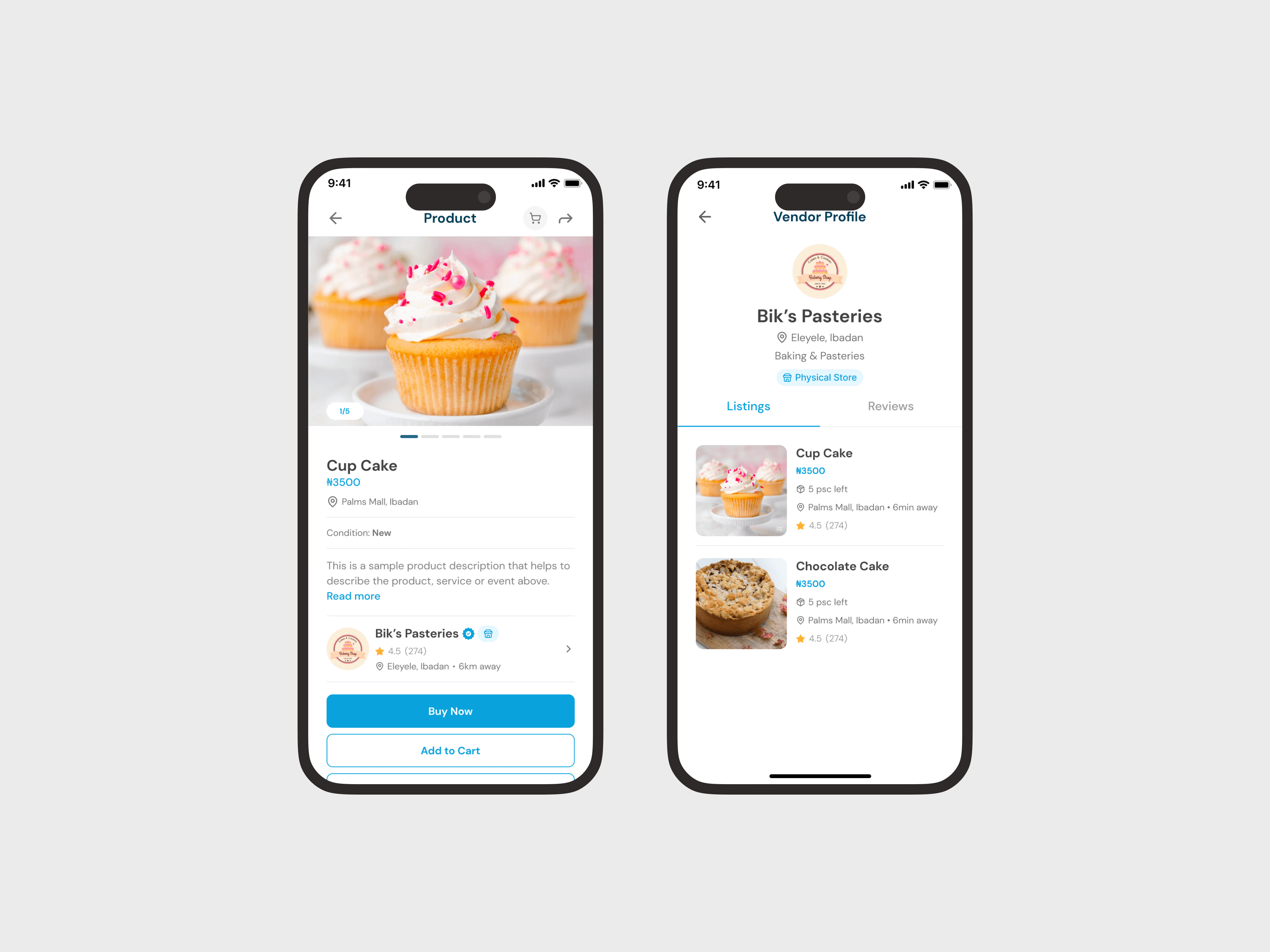 Views that showcases key product information alongside vendor details. Users can easily browse product images, pricing, ratings, and access vendor profiles, helping them make quick, informed decisions.